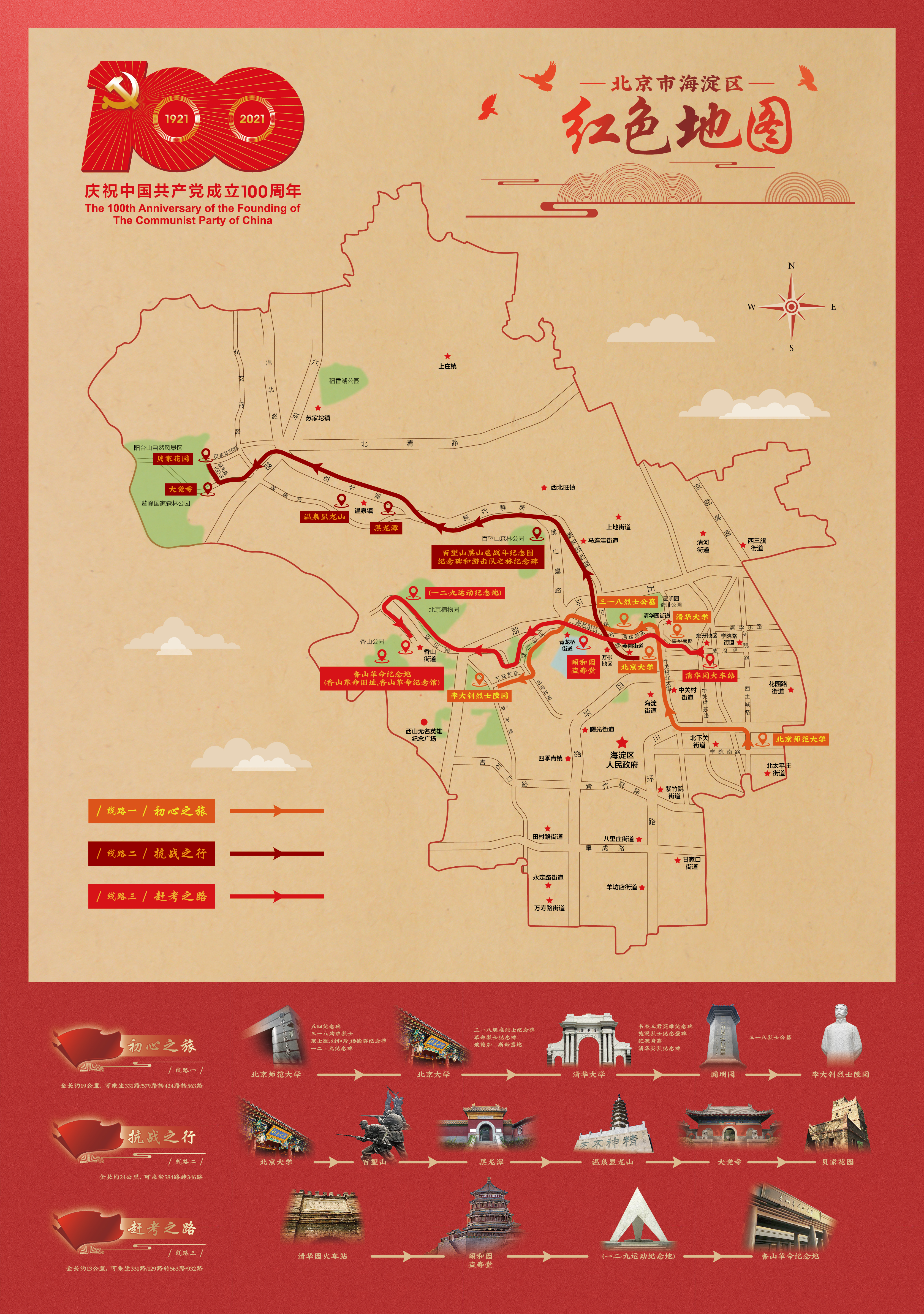 这三条红色线路,围绕北京市建设中国共产党早期北京革命活动、抗日战争、建立新中国三大主题片区,结合海淀党史,以“地图+党史”形式点亮海淀域内15个点位、33处红色遗存,分别为“初心之旅”“抗战之行”“赶考之路”三条主题红色线路。