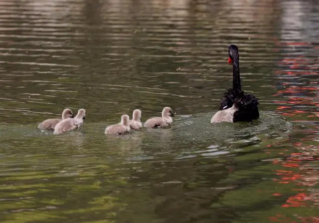 圆明园内天鹅巡游,一只“顽皮”的小天鹅想要钻到妈妈的背上。新京报记者 浦峰 摄