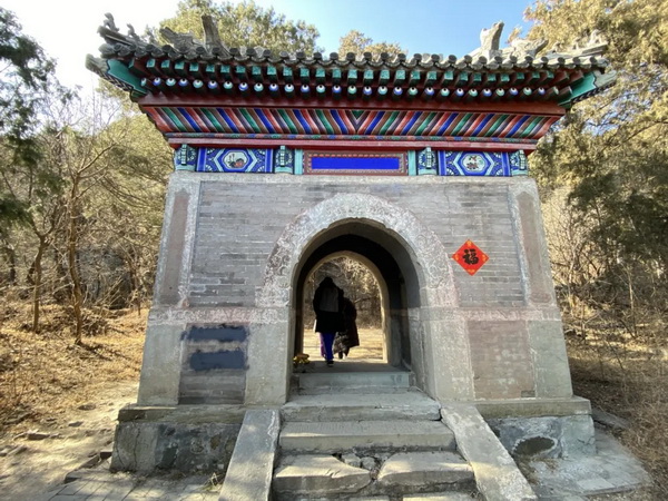 要说“玉皇顶”的得名,还是得在第二条路中访古。在先前的路口右拐,在静福寺防火检查站处进入黑金色的阔气铁门,眼前是稍有曲折的石板路。复行数十步,小路变成了宽度可容马车经过的青石路,行走在其中,古人探访的场景历历在目。再走上一段,静福寺的山门便映入眼帘。