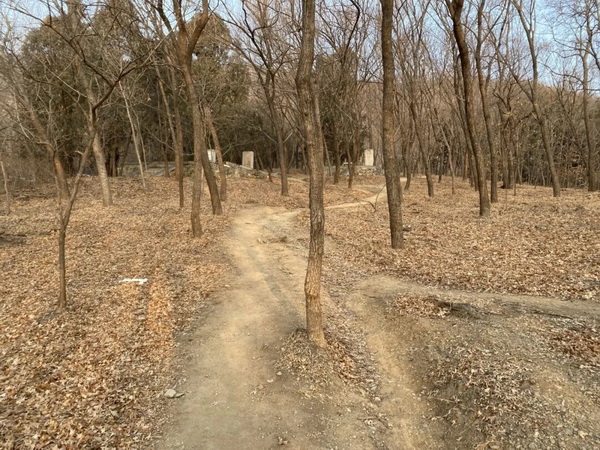前两条路相隔不远,都在玉皇顶上延伸。第三条路则在稍远的东侧,沿万花山的山脊迤逦而上。时值冬日,我自防火道近植物园的四岔路口下行,步过残雪碎石,来到万花山下的一片墓园。