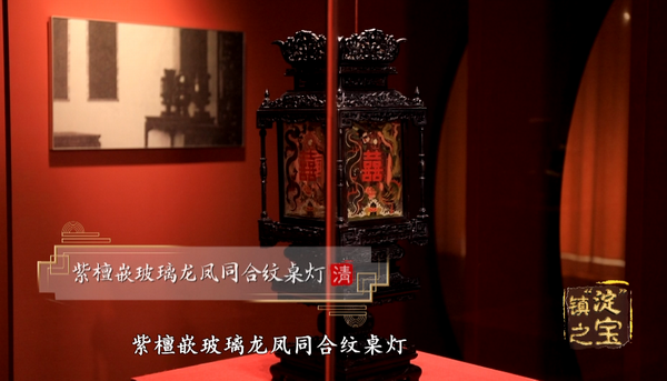 展览中展出了紫檀嵌玻璃龙凤同合纹桌灯,由紫檀木镂空雕刻而成,中间镶嵌的玻璃上绘制了一龙一凤合抱一个“囍”字,就是龙凤同合纹,是帝后大婚才可以使用的纹饰。