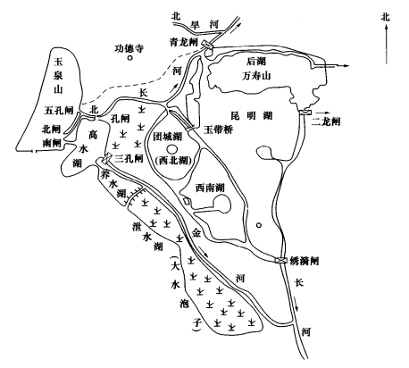 ▲1949年昆明湖及周边水系关系示意图(来源:《昆明湖的历史演变及其环境效应》,下同)