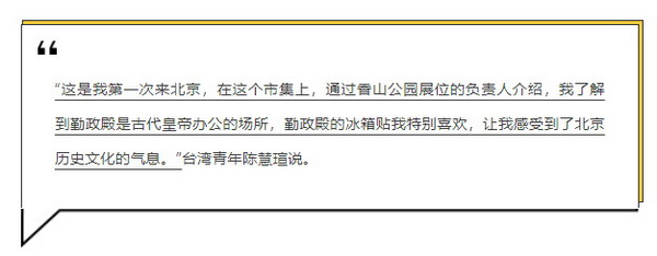 在观潮新消费展台,古法熬煮的酸梅汤、上新了故宫的系列文创产品、具有北京特色的兔儿爷,吸引了不少台湾青年驻足,或欣赏、或品尝,好不惬意。