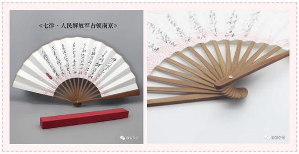 1949年4月,在香山双清别墅的毛泽东,听到南京解放的消息后,挥毫写下了著名的《七律·人民解放军占领南京》。折扇正是以此诗进行设计创作,是收藏或馈赠友人以诗留念的佳品。
