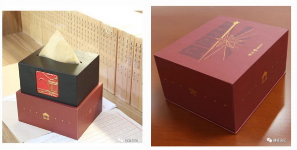 纸抽盒融合了香山红色文化元素——双清别墅标志性建筑六角红亭,木制盒身和三彩瓷片工艺,使红亭更加醒目富有魅力。