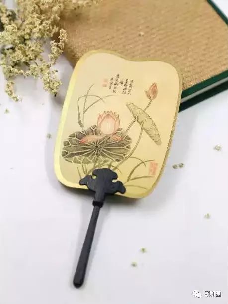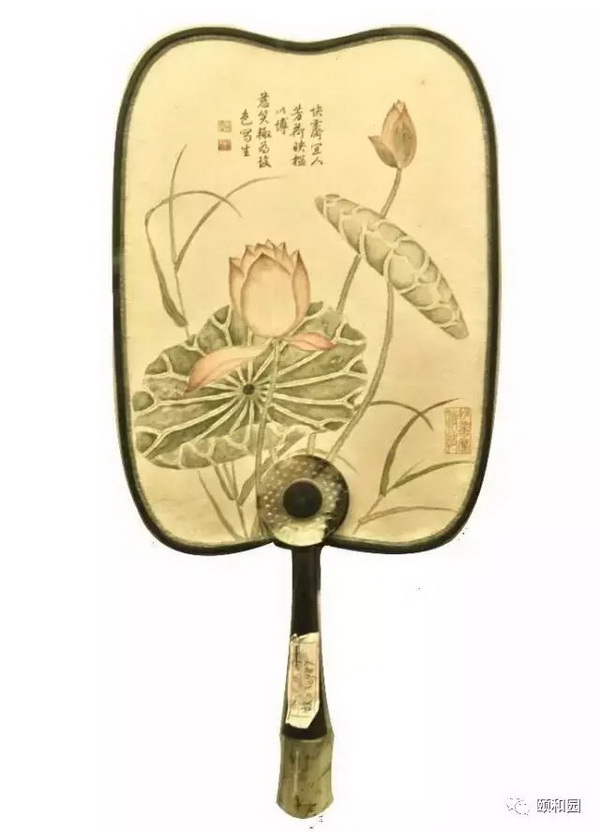 扇子又称“摇风”、“凉友”,是盛夏消暑的必备之物。清宫御园赏荷诗木柄团扇,正面设色绘荷花数支,笔法清润,色调清丽。