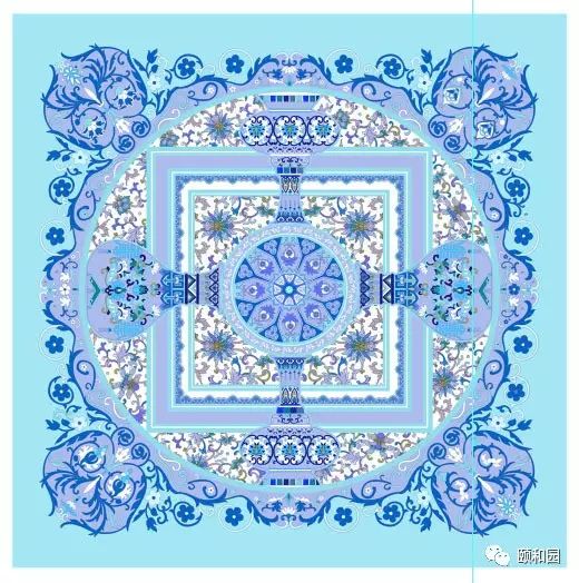 颐和风韵方巾,图案中四只对称宝瓶象征着颐和园内珍贵的园藏文物,正中心的莲花底座与宝瓶一起有表达福寿绵长之意。丝巾以蓝绿色为主色调,源于昆明湖水。纹饰庄重精致,彰显中华民族深厚的文化底蕴。
