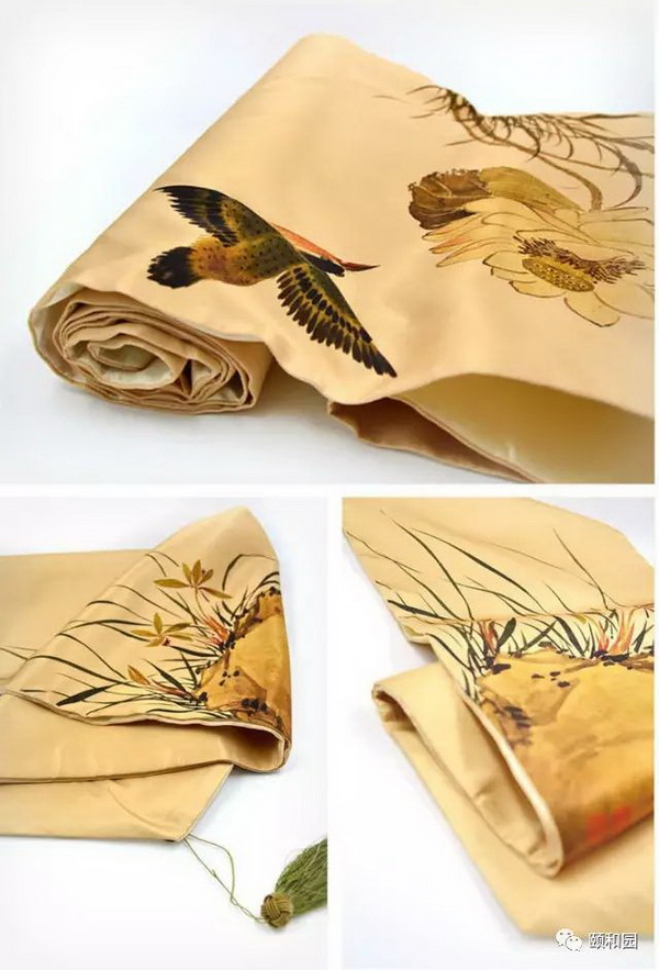桑蚕丝蓬松轻逸,光滑柔软,摩擦时有独特的“丝鸣”现象。将桑蚕丝调染成绢纸的颜色,用现代印花技术,在丝绸上绘制《仿元人写意花鸟图》,画面栩栩如生。