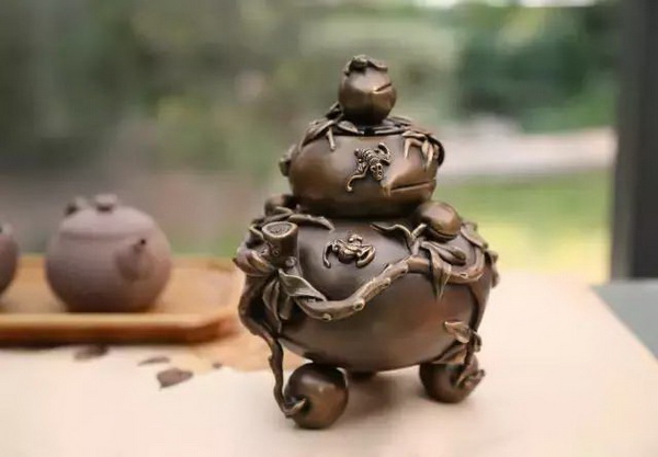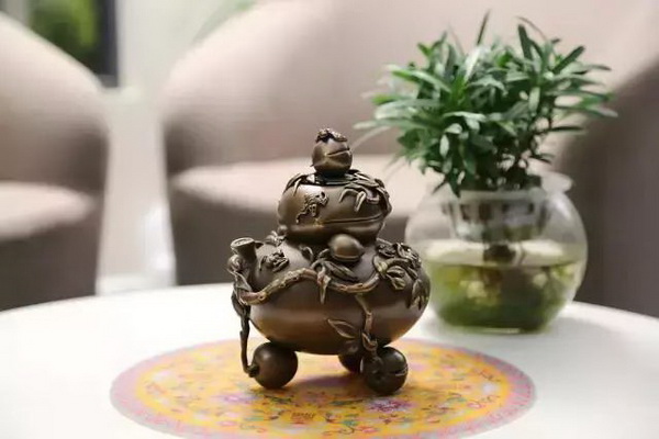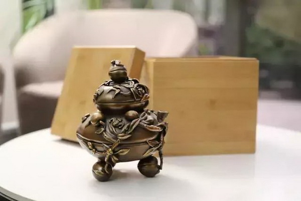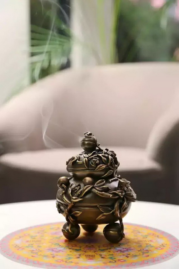 香炉为颐和园乐寿堂九桃香炉同比例缩小摆件。乐寿堂中有四只镀金九桃香炉,是慈禧焚点檀香调节室内空气所用。在中国传统文化中,桃有着吉祥、长寿的寓意。枝木用于驱邪求吉,桃果融入了中国仙话中,隐含长寿、健康的寓意。