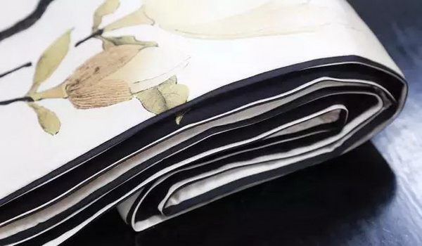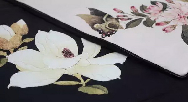 披肩以红色、黑色、米色、灰色、深水绿为主打颜色,尽显大气端庄。图案来源于明清时期的花鸟古画,明末清初陈洪绶的《玉堂柱石图》,清代宫廷画师郎世宁的《仙萼长春图册》和清代余挚的《花鸟册》。