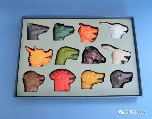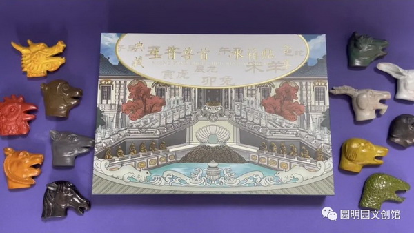 十二生肖兽首冰箱贴包装主体构成元素为海晏堂、天空、云团。包装盒在正面顶端与上侧面交接处采取白色封签的图案设计,并以暗纹的字体内容 “子鼠丑牛……戌狗亥猪”来呼应十二生肖。