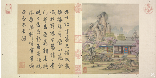 乾隆时期,本景更名“武陵春色”。乾隆四年(1739),乾隆帝得到了宋代画家赵伯驹《桃源图》,卷首乾隆帝题写了“云山春霭钞锣溪”之句。乾隆四十四年(1779),乾隆帝得到明代画家仇英所绘《仿赵伯驹桃源图》,卷首乾隆帝复用“云山春霭钞锣溪”之句,只可惜,此时却忘记了诗句出自何处,于是询问翰林学士,自于敏中以下竟无人知其出处,闲暇之余,乾隆帝翻阅旧刻才得知此源于《桃源经》。原来,元代李公焕注《陶渊明集·桃花源记》时引《桃源经》,“桃源山在县南一十里,西北乃沅水,曲流而南,有障山东带钞锣溪,周回三十有二里,所谓桃花源也。”[1]当得知这一重要讯息时乾隆帝尤为欣喜,他说“恍如重入仙境,顿逢旧踪”。在他心目中,桃花源是一个“云山春霭钞锣溪”的山水世界,这里春意融融而又诗意美好,品诗堂写诗、绾春轩惜春、乐善堂修德养志,难忘的旧居时光里,他俨然栖居于理想的钞锣溪畔。