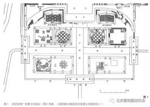 乾隆三十二年(1767年)内务府造办处档案中有“梅花式蒙古包即在含经堂前殿院内搭盖”的记录,可见在含经堂南广场还曾搭建过梅花式蒙古包,其作用主要供乾隆皇帝修行和供佛使用。