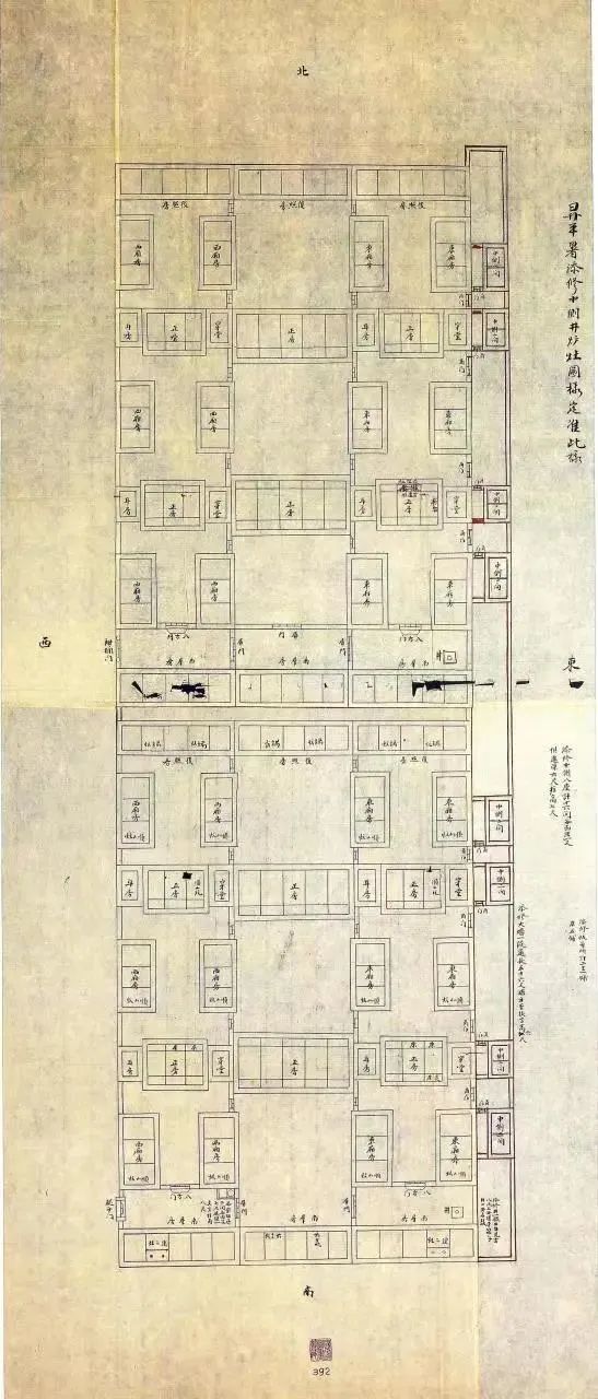 升平署位于东宫门东北侧,建筑规模较大,分为前后两署,各为1座四进院落,共计192间房。样式雷图档中,其建筑布局有两种方案。第一种即392-0512《[谐趣园以东添修升平署房间地盘样]》中东西对称分布5座院落,中间为夹道。图档线条简略,与现状格局完全不同,应为早期设计草案,并未实施。第二种以392-0018《升平署添修中测井炉灶图样》(图11)反映的形制为准,中路由南至北分别为5间南群房、5间正房(前后出廊)带东西厢房各3间、5间正房(前出廊)带东西厢房各3间、后罩房5间带东西厢房各3间。东西路建筑格局相同,由南至北依次为5间南群房、西(东)厢房3间、3间正房(前后出廊)带耳房穿堂各1间、西(东)厢房3间、3间正房(前出廊)带耳房穿堂各1间、后罩房5间带西(东)厢房3间。此外,院落最东侧添修中侧4座8间。前后署形制基本相同,仅前署一进西侧有柴灶房2间,一、二进之间有无院墻和大门的细微差别。