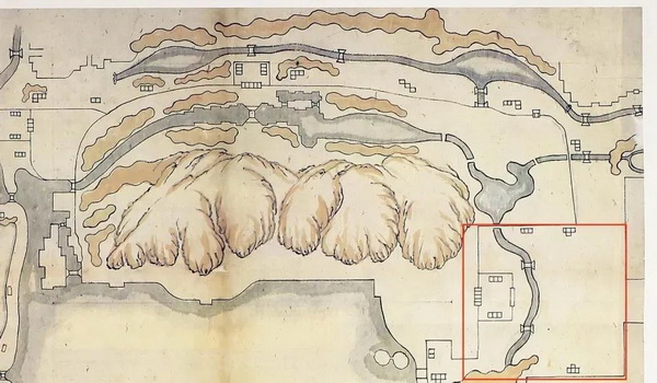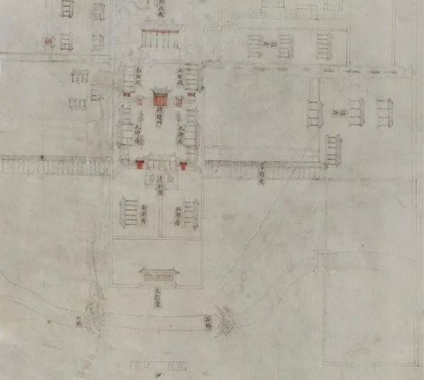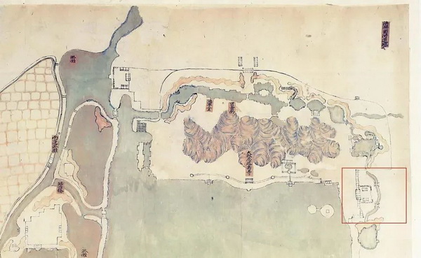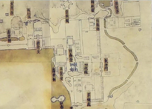 朝房包括群朝房和内广场朝房,为皇帝游园时官员备差或休息的场所。群朝房又称内朝房,位于宫门南北两侧,北侧呈“一”字型,南侧呈“L”型,据342-0666《清漪园地盘画样》和清代绘制的《清漪园图》(图4)可知,北群朝房24间,南群朝房48间,合计72间。