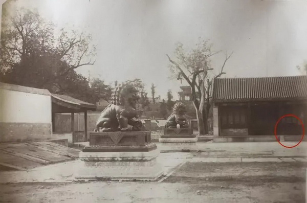 内广场朝房南北各1座,尺寸有3间、5间的分歧。146-0045《清漪园河道地盘样》和349-1205《万寿山全图》中均为面阔3间,而342-0666《清漪园地盘画样》、《崇庆皇太后万寿庆典》和《清漪园图》中皆为面阔5间。借助法国外交官谢满禄1880年至1884年间拍摄的老照片(参图5所标圆圈处)中北朝房檐柱和台阶的位置,可以确定朝房的形制为面阔5间无疑。