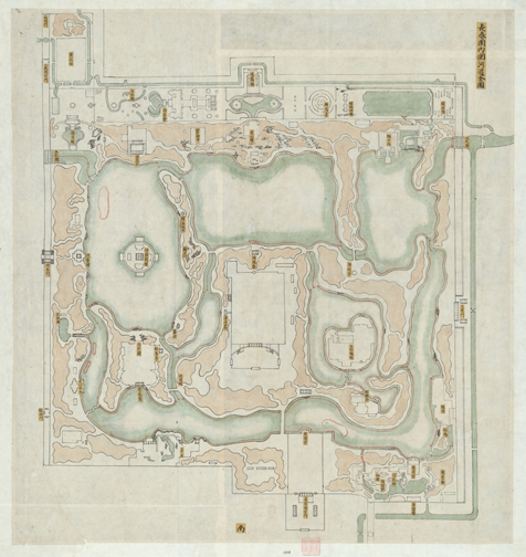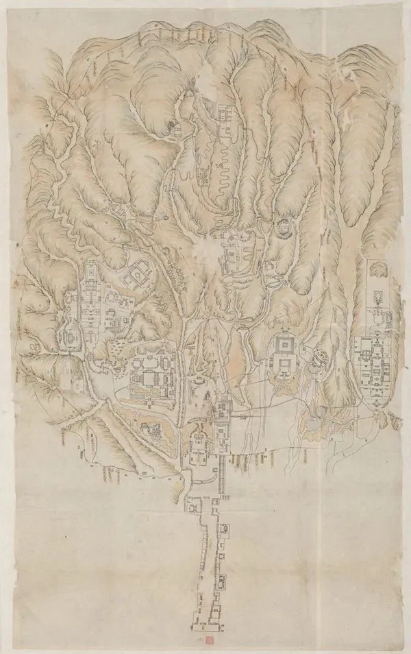 上图“圆明园地盘全图”又名“圆明园河道全图”,是当前已知最早的一幅圆明园全局图,详细绘制了圆明园的全景,包括建筑、水系、山体等,并用黄签标注各景点的名称。