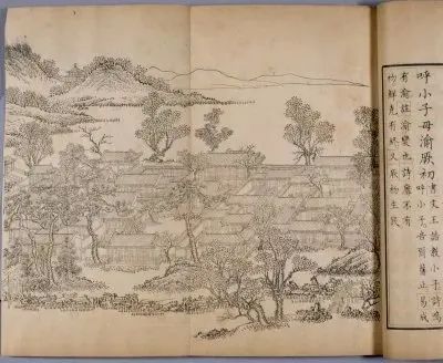 现存木刻本《御制圆明园四十景图诗》另有光绪年间石印摹本:一为光绪十三年(1887)七月天津石印书屋刊印的《御制圆明园图咏》;一为大同书局刊印的《御制避暑山庄、圆明园图咏》一书,“圆明园图咏”所附的四十幅分景图。两种石印摹本的画面在建筑、泉石诸图像及绘画技法方面有颇多相似处,只是册页形制有双开与单开之别,画幅尺寸稍异。光绪十三年石印本的最后一幅图款书“鸿胪寺序班臣孙祜、臣沈源恭画”字样,从款书及画法上看,这两种石印本的四十景图均摹自乾隆十年(1745)孙祜、沈源所绘木刻本《圆明园四十景图诗》。