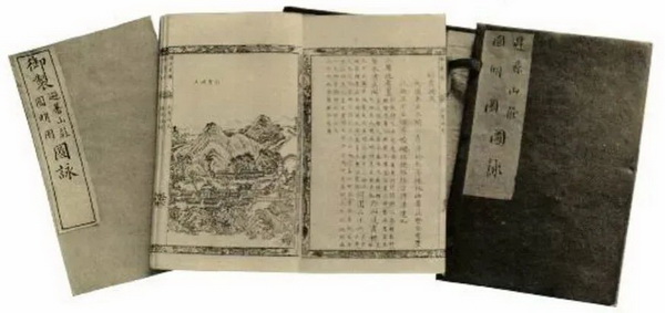 乾隆十年(1745),武英殿刊刻了朱墨套印本《御制圆明园图诗》。印本分上下两册,由孙祜、沈源绘图,采用乾隆帝御题诗文,内附大学士鄂尔泰、张廷玉、任兰枝、张照、汪由敦、刘统勋、梁诗正、钱陈群、励宗万、张若霭、嵩寿、庄有恭、嵇璜、观保等诸臣引经据典详加注释,并由张若霭书写。每页六行,行十六字,小字双行,白口,四周双边,框高 18.7厘米、宽13.2厘米。