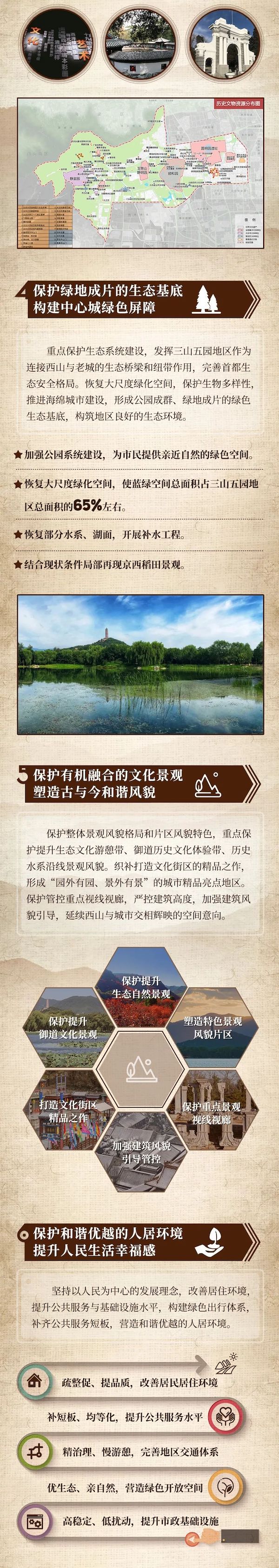 重点保护三山五园联系老城的长河、御道、视线通廊,凸显首都功能与山水环境和谐相融的地区特色;延续三山五园地区作为首都功能重要承载地的特点,完善配套设施,提升整体环境,保障政治中心功能,突出文化中心功能,承载国际交往中心功能,服务科技创新中心功能,充分保障首都功能的发展提升需求。