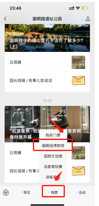 2、点击菜单栏:购票——圆明园博物馆,进入购票小程序。