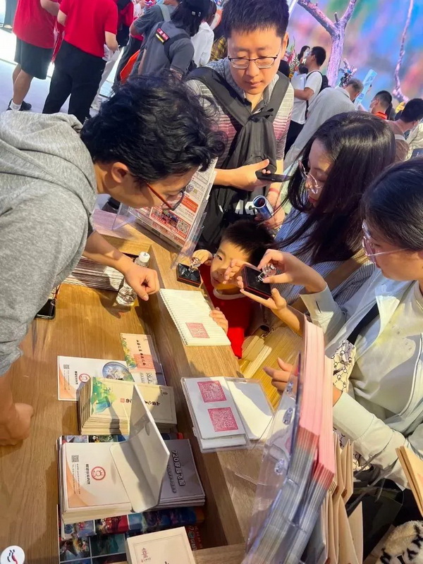 进入到文创文旅展示区,观众可以看到来自圆明园、香山、海淀文旅集团、红楼梦精雅生活、中央美术学院圆明园研究中心等单位精美的三山五园主题文创,观众可以通过现场工作人员的指引扫码线上商城进行购买文创产品。还可以看到由圆明园官方与北京数旅文化科技有限公司倾情打造的互动剧景游产品,以及由海淀文旅集团与首望体验科技公司联手打造的沉浸式数字体验项目——圆明园720穿越飞船,现场还为观众准备了体验券、优惠券、精美小文创等礼物,开展集章活动,增强与观众的互动。