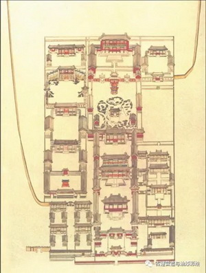 至于畅春园的确切面貌,因为迄今尚未见其盛时的全图,所以只能根据文献记载知其大端。据《日下旧闻考》所载,畅春园坐北朝南,园区南部为议政和居住用的宫殿部分,北部是以水景为主的园林部分。由此可见,畅春园当为京城西郊第一座兼有宫廷和游乐双重功能的离宫型园林。从横向来说,畅春园主体建筑分为中、东、西三路,三路建筑各成体系,但又彼此相连。