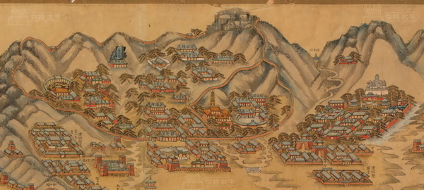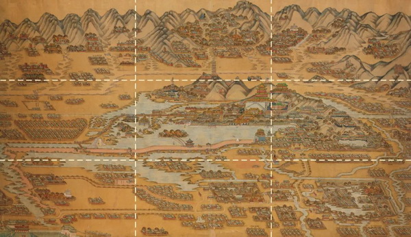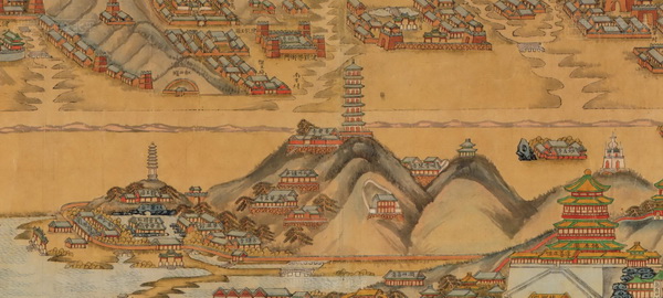 本图采用的就是第二种“山水画法”,全图形象逼真地绘制了京城西郊几乎所有的山峦、河流、园林、宫殿、庙宇、村落等,既秉承了传统“山水画”的意境,又最大限度地还原了当时“三山五园”的壮阔与绚丽。