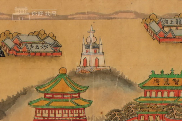 根据图中的景观朝向,我们可知画面方向:上为西,下为东,左为南,右为北。“真觉寺”即今天的“五塔寺”,“觉生寺”即今天的“大钟寺”。