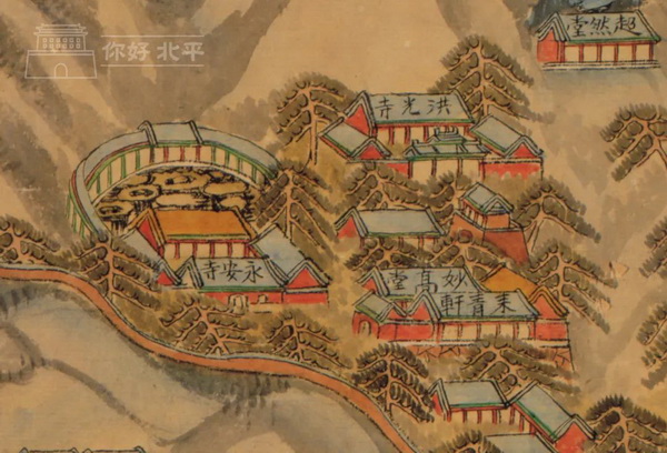 除了以上“三山五园”,“全图”中还有绘有多处寺庙、景观、建筑、村落,举例如下: