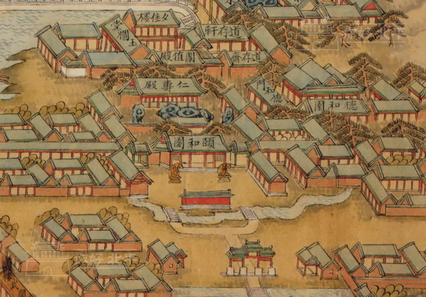 而其它园区面积则被相应的“压缩”,尤其面积更大的圆明园(颐和园占地面积约为4300亩,圆明园占地面积约为5200亩),即便是“近大远小”,但其在画面中也仅占据了颐和园的1/8左右。